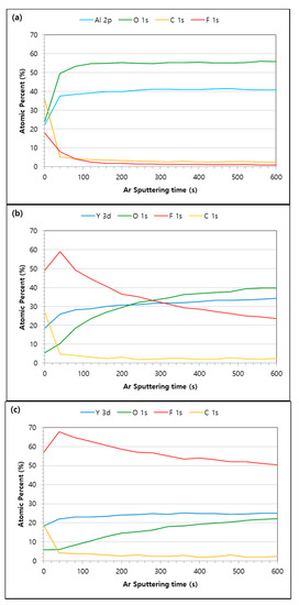 Figure 8 shows the XPS depth profiles of compositions as a function of the Ar+ sputtering time from the surface of the Al2O3, Y2O3, and YOF samples after exposure to CHF3/Ar plasma for 60 min. Fluorination was confirmed on all the surfaces of the Al2O3, Y2O3, and YOF, while the fluorine content on the fluorinated layer of the YOF coating was higher than those of the Al2O3 and Y2O3. The percentages of F atoms reached the maximum values of 58.97% on the fluorinated layer of the Y2O3 coating (Figure 8b) and 17.76% on the Al2O3 bulk (Figure 8a), while the percentage reached the highest value of 67.75% on the YOF coating surface (Figure 8c). Furthermore, the percentage of F atoms started to decrease from the maximum value to the original composition with sputtering time. Given that the fluorine content decreased from 17.76% and approached 0% with sputtering time in Figure 8a, the Al2O3 bulk surface appeared to be barely fluorinated. In addition, the fluorine content on the Y2O3 coating surface was rapidly decreased compared to that on the YOF coating surface (Figure 8b,c). These results indicated that the fluorination layer of the YOF coating was much thicker than that of the Y2O3 coating. This fluorination layer, with a higher concentration of fluorine on the surface, plays an important role in preventing erosion from fluorocarbon plasma and would not easily vaporize because of its chemical stability during the etching process [1,27].