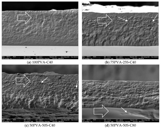 FESEM micrographs of the cross section of PVA composite films containing carvacrol. Big arrows indicate the upper part of the film in contact with the air during the drying process (top) and small arrows, the presence of carvacrol liquid clusters. (a) 100PVA-C40; (b) 75PVA-25S-C40; (c) 50PVA-50S-C40; (d) 50PVA-50S-C80.