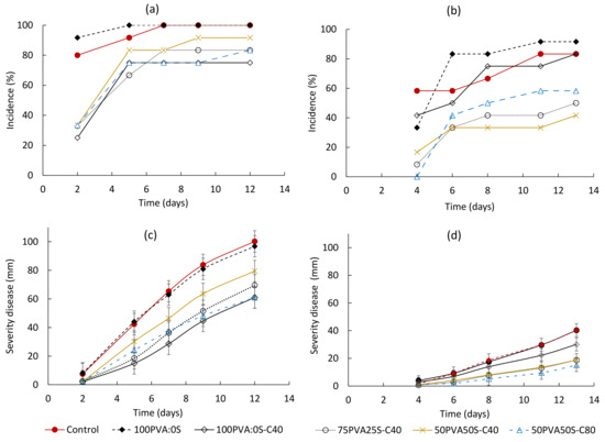 Incidence (%) and severity disease (mm) in apple inoculated with (a,c) Botrytis cinerea and (b,d) Penicillium expansum throughout the incubation time.