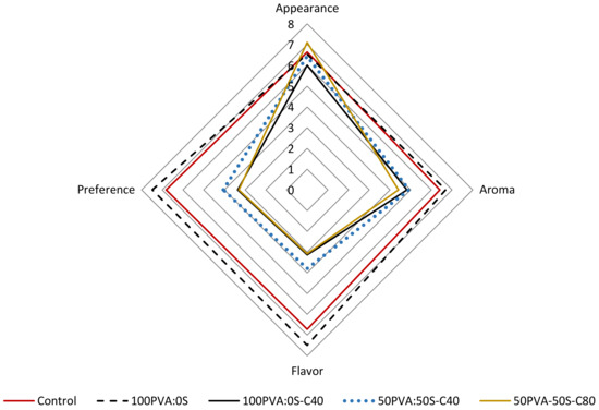 The results of the sensory analysis carried out with the formulations applied to whole apples are summarized in Figure 3. As can be observed, the appearance of the apple was not significantly affected by the coating applications. On the contrary, the judges found significant differences (p < 0.05) regarding the aroma and flavor attributes between uncoated samples or ones coated only with pure PVA and those samples treated with the active coatings due to the negative impact of the odor and taste of carvacrol. Similar results have been previously observed by other authors for other carvacrol-loaded coatings [54].