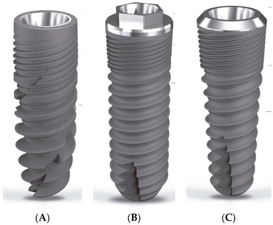 Type of implants. (A) Naturactis®: internal conical connection (ICC) subcrestal-level; (B) Uneva®: external connection (EC) crestal level; (C) Naturall®: ICC crestal level.