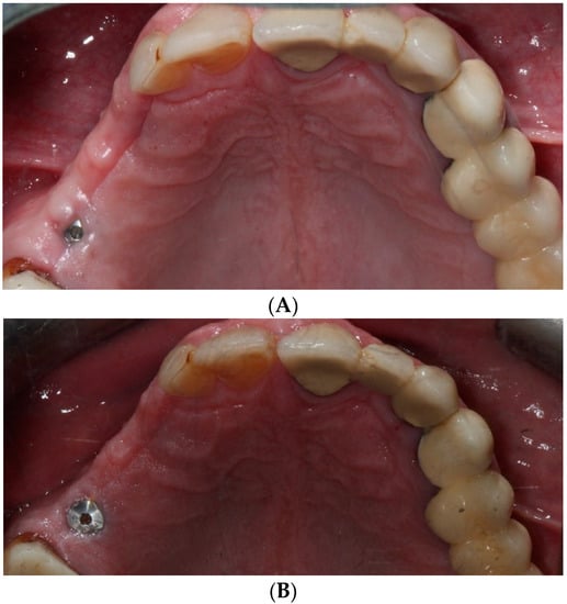 (A) EC implant, cover screw one month after placement; (B) EC implant, cover screw 3 months after placement.