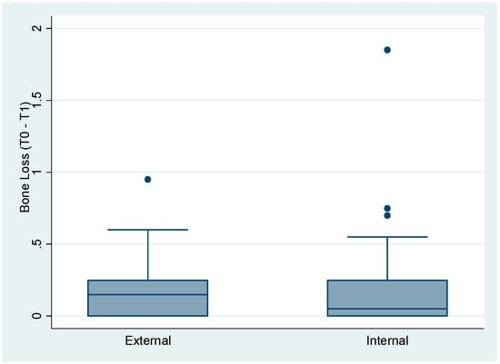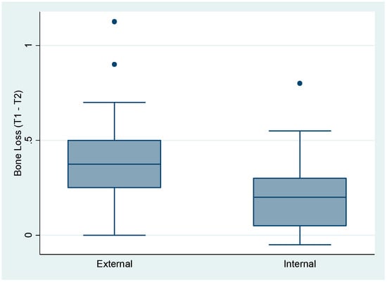 Bone loss (mm) in internal vs. external connection implants between the first and second measurements (T0–T1).