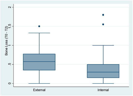 Bone loss (mm) in internal vs. external connection implants between the first and third measurements (T0–T2).