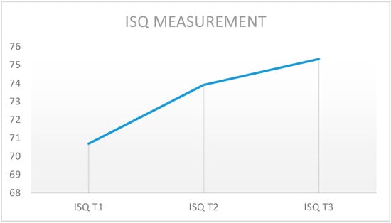 Measured values increased as the implant osseointegration period progressed (T0: 70.69; T1: 73.91; T2: 75.32) (Table 3, Figure 7).