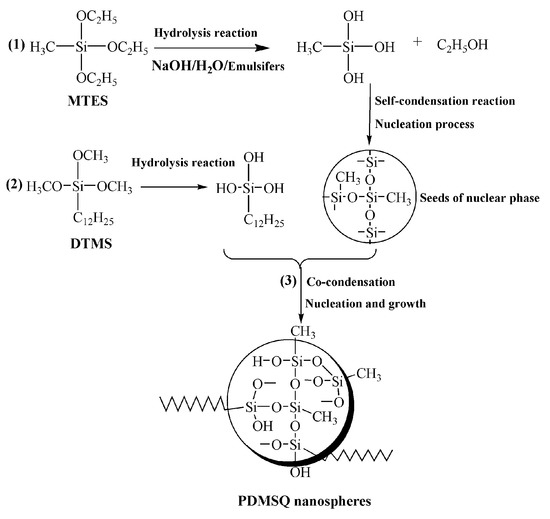 Hydrophobic PDMSQ nanoparticles were prepared by the hydrolysis–condensation reaction of methyl triethoxysilane (MTES) and dodecyl trimethoxysilane (DTMS) in the SDBS/Tween 80 mixed emulsifiers aqueous solution. So, formation mechanism of the PDMSQ nanospheres is mainly composed of the following three procedures, as illustrated in Figure 1: (1) MTES is first hydrolyzed to generate methylsilanol under the action of base catalyst, and then methylsilanol undergoes the self-condensation reaction to form Si–O–Si networks, thus many tiny nuclear phase seeds have been formed. (2) DTMS is also hydrolyzed to produce dodecylsilanol which then is co-condensed with seeds of nuclear phase. (3) The growth stage of the nuclear phase seeds to the final PDMSQ nanoparticles, i.e., the transfer of monomers from droplets to numerous nuclear phase seeds, persistent condensation reaction and formation of the PDMSQ particles, are finally accomplished.
