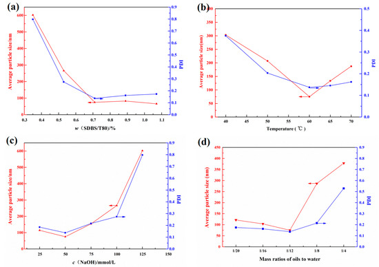 Firstly, the reaction temperature, the concentration of NaOH and the oil–water mass ratio were immobilized as 60 °C, 50 mmol/L and 1:12, respectively, and the mass concentration of the compound emulsifiers was varied between 0.35 wt.% and 1.07 wt.% to explore its effect on the mean particle size and distribution of PDMSQ NPs. The result is shown in Figure 2a. As can be seen, the average particle size and its polydispersity index (PDI) of PDMSQ latex particles rapidly decreased when the compound emulsifier dosage was increased from 0.36 wt.% to 0.71 wt.%, whereas this downward trend would flatten out and tended to be almost constant when w (SDBS/T80) was greater than 0.71 wt.%. At this time, the mean diameter and PDI of PDMSQ latex particles were all less than 100 nm and 0.2, respectively. This experimental consequence is probably related to a mechanism of the micellar nucleation although the hydrolysis–condensation reactions, rather than radical polymerization, are involved in the mixed emulsions for the present experimental system. Specifically, solubilizing micelles containing the silane monomers are the sites of the hydrolysis–condensation reactions, and particle nucleation first starts there. Then, the transfer of monomers from droplets to solubilizing micelles, particles growth and formation of polymer particles are continuously completed as described in reference [20]. Therefore, the less the emulsifier dosage is, the lower the micelles concentration in the system and the fewer number of the nucleation particles are. Moreover, the hydrolysis–condensation reactions will not proceed uniformly under the lower amounts of micelles concentration. In this way, the average particle size and PDI of PDMSQ NPs are relatively large under the same amount of monomers. While the emulsifier contents are increased to some extent (larger than 0.71 wt.% under the current system), the micelles concentration is sufficiently large to prompt the number of nucleation particles to increase rapidly and the polymer particles to grow completely. Thus, the as-prepared PDMSQ NPs possess a relatively small particle size and PDI. Considering these above findings, the optimal mixed emulsifier dosage is chosen as 0.71 wt.%.