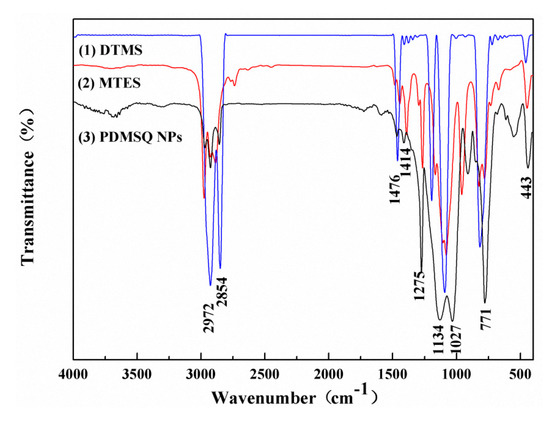 FTIR spectra of the reactants and the product were tested and are compared in Figure 6. Obviously, the following absorption peaks were all located in three curves: the characteristic peaks at 2971, 2854, 1476 and 1414 cm−1, and strong absorption peaks at 1275 and 771 cm−1, were severally originated from the stretching vibration and wagging vibration of C–H bonds in methyl and methylene groups, the symmetrical deformation vibration of the C–H bond in Si–CH3, and the stretching vibration of the Si–C bond. However, there were new strong double-shoulder peaks at 1134–1027 cm−1 in the PDMSQ spectrum rather than in the MTES and DTMS spectra. Those phenomena demonstrate that the hydrolysis–condensation reactions have been implemented and the inorganic skeleton of Si–O–Si has been formed. In addition, the tiny absorption peak at 3310 cm−1 was deduced from the signal of the incompletely-condensed Si–OH in the PDMSQ NPs curve. Thus, it is inferred that PDMSQ NPs have the expected chemical structure.