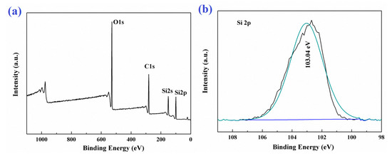 In order to further confirm the surface chemical composition of the PDMSQ NPs, X-ray photoelectron spectrometer (XPS) analysis was performed in this experiment and the results are shown in Figure 8, such as the XPS wide spectrum and Si2p high resolution spectrum. As shown in Figure 8a, there were three elements of carbon, oxygen and silicon on the PDMSQ NPs surface, atomic mass contents of which were 41.73 wt.%, 30.62 wt.% and 27.65 wt.%, respectively, and the mass content of carbon was the largest. This indicates that the surface of PDMSQ NPs is covered by a large amount of methyl and methylene groups and it will be very helpful to reduce the surface free energy of the PDMSQ NPs surface. It is also detected from Figure 8b of the Si2p high resolution spectrum that there were no characteristic absorption peaks of inorganic SiO2 and organic polysiloxane, except for the signal of Si2p in polysilsesquioxane at the binding energy of 103.34 eV. This result further confirms that the PDMSQ NPs have the expected chemical structure.