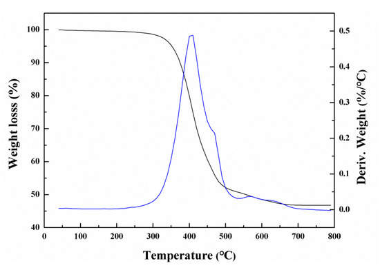 Thermal stability of the sample was analyzed by a thermogravimeter (Q500, TA Co., Ltd., New Castle, DE, USA) where the heating rate of 10 °C/min was applied under the inert atmosphere and the temperature range was from the ambient temperature to 800 °C.