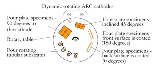 The PVD coatings being studied were produced at the Material Engineering Research Centre, Tallinn University of Technology. The PVD unit, a Platit π-80 with Lateral Rotating ARC-Cathode technology, and with two rotating cathodes embedded in the door of the vacuum chamber, was used for deposition. The commercial coatings being used were deposited on specimens whose roughness was similar to that of cutting tools. A schematic for the placement of specimens in the vacuum chamber is presented in Figure 1. The tubes had two different wall thicknesses (outer diameter d1 × inner diameter d2 × length), shown as Tube 1 (3.0 mm × 2.70 mm × 167.37 mm) and Tube 2 (3.0 mm × 2.50 mm × 167.57 mm), and these were affixed vertically within the rotary table (which had a rotational speed of 12 rpm) inside the vacuum chamber. To prevent the coating being deposited on the cross-section of the tube ends, they were closed off at the nozzle, so that the entire outer surface of the tube could be coated [11]. At the same time, the tube was vertically fixed by the lower nozzle to the rotary table in the deposition chamber, and it was simultaneously rotated around its axis (Figure 1).
