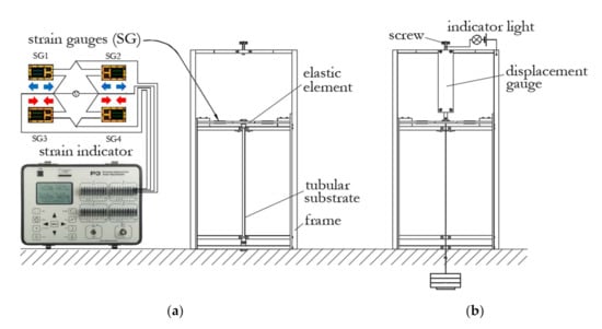 The calibration of the length measuring unit is a separate task. The length change in the tubular substrate was transformed to the deformation of the elastic element, which was measured by four strain gauges (Figure 2a). The schematic for the calibration work is presented in Figure 2b. The displacement of the middle cross-section of the elastic element, depending upon the units of the strain indicator in the case of unloading, is presented in Figure 3. During the process of calibration, the readings were taken at a point in time at which rotation of the screw turned off the indicator light.