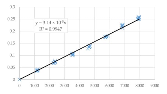 The constant should be determined so that the relation is approximated in the best way possible by minimizing the square of error; by using the software, MS Excel 2016, this was found by using the regression analysis function. As a result, a constant of 3.14 × 10−5 mm per unit of the strain indicator was obtained. A constant of 8.26 × 10−5 mm per unit was also used before modifications were carried out on the length measuring unit [11]. The modified unit has 2.63 times higher sensitivity levels.