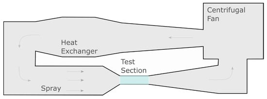 The icing and contamination research facility (iCORE) is a closed-loop wind tunnel equipped with a test section 100 mm wide and 150 mm high. The wind tunnel is fitted with an additional cooling section and spray section, Figure 2. The coolant flowing through the heat exchanger in the cooling section is pressurized by three compressors, one of which with variable power, allowing the air in the wind tunnel to reach temperatures as low as −40 °C. The spray section, upstream of the test section, includes three horizontally aligned, internal mix, air atomizing nozzles capable of producing water droplet clouds with a median volumetric droplet diameter (MVD) of 2 = 20 µm, and a resulting liquid water content (LWC) of up to 2.0 g/m3 in the test section. The icing wind tunnel is driven by a fan, which can force air into the tests section up to a speed of = 140 m/s. Assuming laminar flow, a water droplet in the test section would have a Weber number, = 2800, and a dynamic wetting pressure of Here, is the density of water, the impact velocity, the interfacial tension, and R the radius of the droplet. Further details on the icing wind tunnel and its calibration have been presented by Hauk et al. [22].