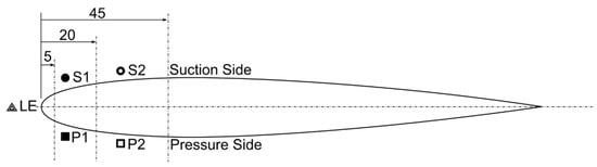 Diagram of the NACA 0012 support with 180 mm-chord length and labels for positions on the fabrics. LE: leading edge, or stagnation line; S1, S2: suction side; P1, P2: pressure side.