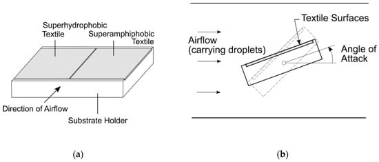 Configuration of fabric mounted to a flat plate sample holder in the icing wind tunnel test section. (a) Side-by-side arrangement of fabrics in the flat plate substrate holder; (b) Side view of the configuration in the test section showing the direction of airflow, top and bottom test section walls, and the two tested angles of the sample holder.