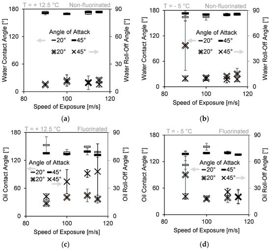 The oil wetting properties of superamphiphobic fabrics exposed to a water droplet cloud at airspeeds of 90–115 m/s, at freezing and non-freezing temperatures, and on a flat plate at two constant angles of attack are plotted in Figure 6c,d. Figure 6c represents fabrics tested in a warm cloud at 12.5 °C. It shows that the oil contact angle remained between 140° and 160° and an oil roll-off angle below 50°. The higher wear at an angle of attack of 45° can be rationalized by a higher direct exposure to droplets and air than at 20°. It was expected that the superhydrophobic fabrics would show the same trend, however that was not the case. Oil has a lower surface tension than water and the differences between the two wettabilities could lie in the sensitivity of the testing liquid to different degrees of damage. In general, the optical nature of the fabric (macroscopically visible roughness and lack of reflectivity), made it difficult to obtain an accurate mathematical fit with the oil droplets, resulting in a higher standard deviation than on the superhydrophobic fabrics.