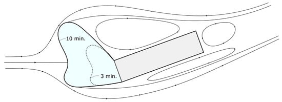 Sketch of air pathlines over a rectangular body after 3 and 10 min of icing. Bluish area: Sketch of accreted ice.