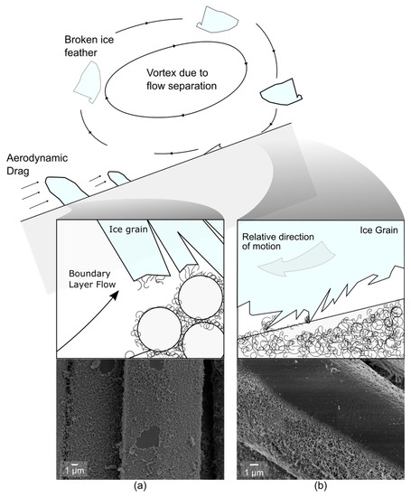 Sketch of two envisioned damage mechanisms of the flat plate configuration. (a) One being the tearing of an isolated feather ice grain from the fabric surface due to aerodynamic drag. (b) The second being after breakage of the feathery ice grain, it being carried, by a separated backflow of air, away from the surface and then back towards it, causing erosive or scratching damage to surface nanofilaments. The insets are SEM images of either pulling or erosive damage that was observed from experiments.