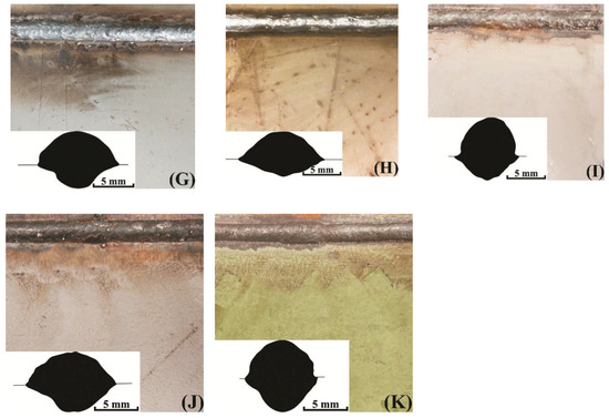 Coating surfaces and weld seam sections’ profiles: (A) no coating; (B) AK-070; (C) VL-023; (D) GF-021 Express; (E) EpoxyCoat-0263S; (F) EpoxyCoat-019; (G) EpoxyCoat Mastic; (H) EpoxyCoat Zinc; (I) OS-51-03 grey; (J) OS-56-22 grey; (K) OS-82-01 green.