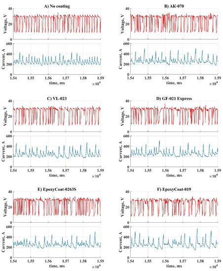 Since the breakdown products have such an impact on the welding quality, it is necessary to use the most suitable set of the welding parameters in gas metal arc welding (GMAW) with any coating. To choose or develop the special welding set of parameters for a particular set of conditions (like coating breakdown products presence), current and voltage waveforms and their deviation in these conditions should firstly be studied [24,25,26,27].