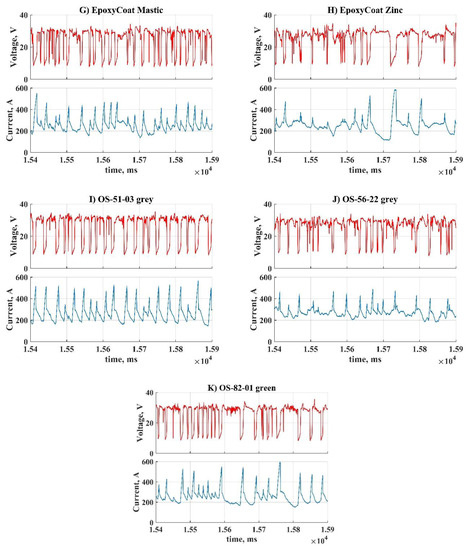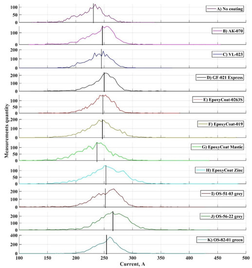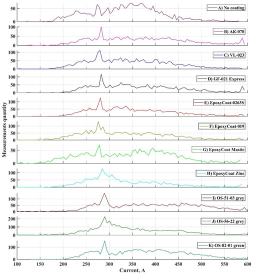 Profiles of mean arc current histograms: (A) No coating; (B) AK-070; (C) VL-023; (D) GF-021 Express; (E) EpoxyCoat-0263S; (F) EpoxyCoat-019; (G) EpoxyCoat Mastic; (H) EpoxyCoat Zinc; (I) OS-51-03 grey; (J) OS-56-22 grey; (K) OS-82-01 green.