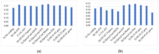 The coatings AK-070, VL-023, GF-021 Express, EpoxyCoat-0263S, EpoxyCoat Zinc, EpoxyCoat-019, and EpoxyCoat Mastic were applied to a cleaned and degreased surface with a roller in one layer (EpoxyCoat-019 in two layers) and were air-dried at the room temperature (23 °C). Organosilicate coatings were applied with a roller in four layers. OS-51-03 grey and OS-56-22 grey were cured by the introduction of 0.5 wt.% of 3-aminopropyltriethoxysilane hardener agent at the room temperature, while OS-82-01 green was cured in a furnace with a heating rate of 2 °C/min and a soaking time of 3 h at a temperature of 250 °C [14].