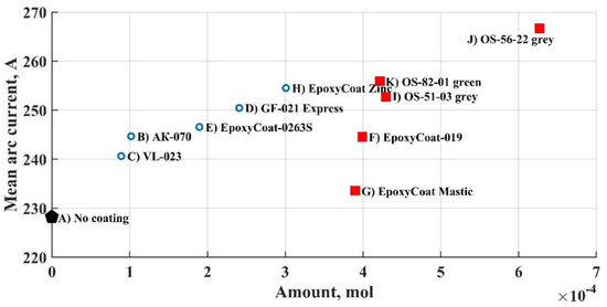 The higher the oxygen amount in the coating, the higher is the mean arc current. This relation tends to be linear, but there are two groups of coatings in the graph (Figure 7): groups A (blue circles) and B (red squares). Such a division in two groups can be explained by difference in thickness: in group A coatings have thickness equal or less than 100 μm, and in group B they are significantly thicker. Thickness could have influenced the arc current in a complex way by the drastic difference in the amount of any substances produced during coatings breakdown, but the main relation between the oxygen amount and the arc current can be explained through the carbon monoxide formation during welding.