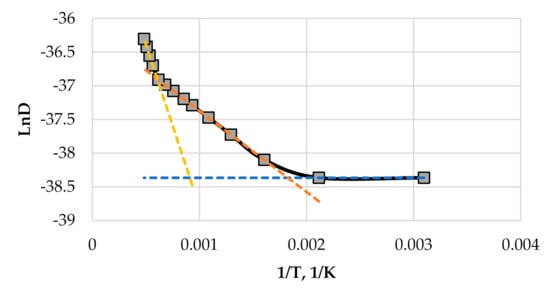 where i = iA + iB is the total flux of components A and B, α, β, and δ are the proportionality coefficients (values of 0.025, 0.225, 2 are used in our calculations, respectively), Q1, Q2 are the activation energies of radiation enhanced diffusion and thermal diffusion, respectively (10 kJ/mol and 40 kJ/mol are used, respectively). In calculations, the melting temperature Tm = ~3000 K (value close to the melting temperature ceramics) is used. The plot of diffusion coefficient vs. substrate temperature used in calculations is given in Figure 1.