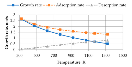 The dependence of total growth rate (solid line) on substrate temperature used in calculations. By dot lines, the partial components of growth rate (Equation (7)), adsorption, and desorption rates are shown.