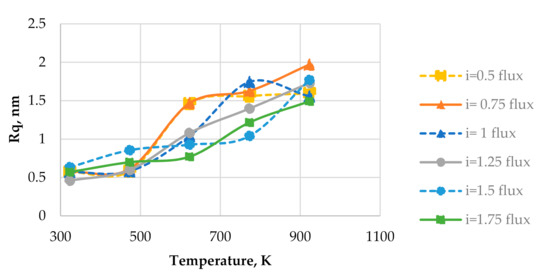 Figure 3 shows the plots of surface roughness Rq vs. substrate temperature calculated by using different relative fluxes of particles arriving at the surface. The relative concentrations of components in simulated thin films are cA = 30%, cB = 70%. Any point in Figure 3 is an average roughness value from three calculations using different initial conditions. From Figure 3, it is seen that the surface roughness Rq increases with the increase in the substrate temperature. This tendency is observed for all relative fluxes that were examined. From Equations (6) and (7), it is seen that changes in the relative flux affect both values of diffusion coefficients and growth rate (the relative flux is directly proportional to both of those values).
