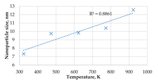 Figure 4 shows the plot of nano-particle size of phase A in the horizontal directions (or directions parallel to the substrate surface) vs. substrate temperature at relative flux of i = 1 s−1. From Figure 4, it is seen that the average nano-particle size increases linearly from 7 to 12.5 nm as the substrate temperature rises from 323 to 923 K. From Figure 3 and Figure 4, one can notice that both the surface roughness Rq and the average nano-particle size increase monotonously as the substrate temperature rises. The similar relationships between substrate temperature and nano-particle size were also reported in other experimental studies [27,28] and theoretical works [29,30].