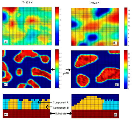 Figure 5 shows pairs of the surface maps (a, b), the concentrations plots of component A in the surface layer (c, d), and cross-sectional views (e, f) obtained with different substrate temperatures of 323 K (a, c, e) and 923 K (b, c, f) and constant relative flux of i = 1 s−1. The cross-sectional views are given through the plane y = 18, which is marked in the concentration plots. Brown color in Figure 5a,b indicates regions of the thin films in which their thicknesses are greatest. Since the substrate initially occupies five layers (layer thickness is 1 nm) in the computational grid and 5 nm is the lowest thickness observed in images given in Figure 5a,b, blue color in those images marks regions of the substrate, which are still not covered with either phase A or phase B. Brown color in Figure 5c,d indicates regions of the surface of the thin films, which are made of phase A (the relative concentration of A is 1.0). Blue color in Figure 5c,d marks regions that are made of either phase B or the substrate material, i.e., regions free of component A (in those images substrate material can be distinguished from phase B by using the respective surface maps given in Figure 5a,b). Cyan color in Figure 5e,f represents regions made of phase A; yellow color in those images marks regions made of phase B. It should be noted that the average nano-particle size (given in Figure 4) was assessed from the concentration plots of component A that are partially given (for two substrate temperatures) in Figure 5c,d.