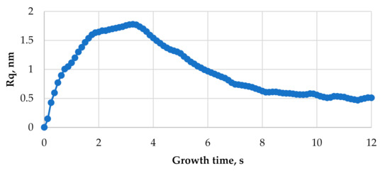 Figure 6 shows the evolution in time of the surface roughness of the thin film grown at the substrate temperature of 773 K with the relative particle flux of i = 1 s−1. The curve passes maximum; at the beginning of deposition process, surface roughness increases and then starts to decrease. The similar kinetics of surface roughness are obtained by using Mote Carlo simulation techniques [32]. From Figure 6, it is seen that the surface roughness most rapidly increases during first two seconds of the film growth. From 2 s to 3.2 s, the surface roughness increases slower with time in comparison to first two seconds. At the growth time of ~3.25 s, the surface roughness reaches its maximum value and stars to decrease thereafter. The surface roughness decrease rate is highest during the period between 3.5 s and 7 s; after this period, the surface roughness starts to decrease slower and only negligible surface roughness oscillations are observed during the last few seconds.