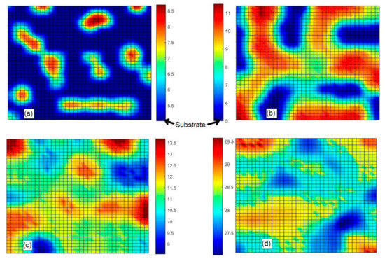 In order to understand the kinetics of surface roughness shown in Figure 6, the surface maps at different typical times t = 0.625 s (before maximum), t = 3.25 s (maximum point), t = 6.375 s (after maximum), and t = 12 s (last point in Figure 6) are given in Figure 7. At times t = 0.625 s and t = 6.375 s, the surface roughness Rq = 0.895 nm is the same. Colormaps are given next to the respective surface map. Brown color in all surface maps given in Figure 7 indicates regions of the thin films in which their thicknesses are greatest. Blue color marks regions in which the thicknesses of films are lowest; in Figure 7a,b, substrate regions that are not covered with either phase A or phase B are marked with blue color. Phases of components A or B cannot be distinguished from maps given in Figure 7. Concentration plots of both components are needed in order to distinguish those two phases. From Figure 6, it can be seen the surface maps given in Figure 7a,c correspond to two cases at which the surface roughness of ~0.895 nm is the same. The surface map given in Figure 7b corresponds to the moment at which the highest value of the surface roughness is reached. From Figure 7a, it is seen that at an early growth time, there is a group of nano-islands formed on the substrate. Less than half of the substrate area is covered with nano-islands. The diameters of nano-islands vary in the range from 5 to 8 nm. The height of the highest nano-island is about 3.5 nm. In Figure 7b, we observe larger and higher nano-islands, some of them are already connected to each other. The height of the highest nano-island is about 5.5 nm at the growth time of 3.25 s. From Figure 7b, it is also seen that there are substrate areas that are still not covered with either phase A or B (marked with blue color in Figure 7b), and blue and brown areas in Figure 7b occupy pretty similar fractions of the surface area, which results in the relatively high surface roughness observed at t = 3.25 s. After t = 3.25 s, phases made of components A or B grow relatively fast on those uncovered substrate areas (blue regions in Figure 7b) in comparison to the tops of nano-islands. From the surface map, taken ~3.1 s later (at t = 6.375 s) that is given in Figure 7c, it is seen that the whole substrate is covered with phases made of depositing species. In Figure 7c, there are no such deep valleys between growing nano-islands, as it is seen in Figure 7b. This also explains the lower value of the surface roughness observed at t = 6.375 s. From Figure 6, it is seen that the surface roughness Rq decreases from t = 3.25 to ~10 s and starts slightly oscillating thereafter. The final surface map is given in Figure 7d. In this surface map, we observe a minimum variation in the thickness of the film in comparison to all other surface maps given in Figure 7.