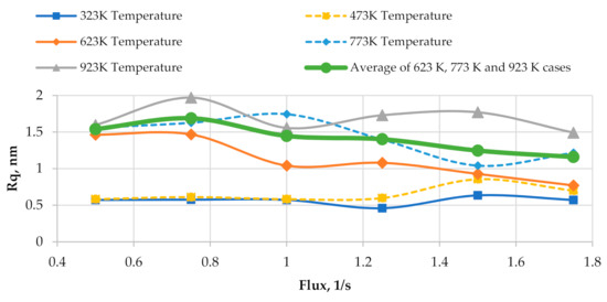 Figure 8 shows the plots of surface roughness as a function of relative flux at different substrate temperatures. Figure 8 uses the same data that were used in Figure 3. The average surface roughness for substrate temperatures of 623 K, 773 K, and 923 K (>0.2Tm) is also given in Figure 8. From Figure 8, it is seen that the flux density does not have any consistent influence on the surface roughness at the substrate temperatures of 323 K and 473 K (<0.2Tm). The presence of flux density i in the dependencies of diffusion coefficient and growth rate on the substrate temperature is the reason for a weak influence of the flux density on the surface roughness at two lowest considered temperatures. From Equation (6), it is seen that the flux i is directly proportional to the diffusion coefficients Dm. From Equation (7), it is seen that the flux density i is directly proportional to the growth rate. It is known that an increase in the diffusion coefficient alone results in an increase in the average size of nanoparticles in the horizontal directions. Since the surface roughness correlates to the average size of nanoparticles in the considered case, an increase in the diffusion coefficient alone results in an increase in the surface roughness. However, it is also known that an increase in the growth rate alone results in a decrease in the average size of nanoparticles. The correlation between the average size of nanoparticles and the surface roughness is retained in this case, so an increase in the growth rate alone results in a decrease in the surface roughness. This is the opposite effect in comparison to that of an increase in the diffusion coefficient alone, so an increase in the flux density i, which causes the linear increases in the diffusion coefficient and the growth rate, induces two counteracting effects and has no significant influence on the surface roughness at the two lowest considered substrate temperatures.
