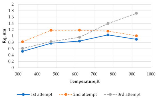 Figure 9 shows three plots of the surface roughness vs. substrate temperature at the relative flux i = 0.5 s−1 obtained by using three different initial conditions. Points obtained by using the same initial condition are connected to each other with the same line type. The average of three given curves is presented in Figure 3 (see the curve obtained by using i = 0.5 s−1). From Figure 9, it is seen that an initial condition may significantly affect the dependence of surface roughness on temperature. Values of Rq corresponding to the first and the third experiments mostly increase as the substrate temperature rises, but the curve corresponding to the second experiment shows different behavior. In this case, the slight decrease in the surface roughness is observed as the substrate temperature varies from 623 K to 923 K.