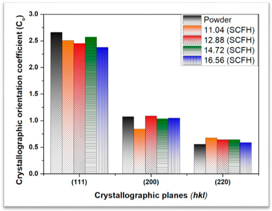 NiTec powder and coatings deposited at different oxygen flow conditions were structurally analyzed in a previous paper [10], where we showed that the powder is largely replicated when it is deposited on the substrate, and the peak corresponding to Ni (111) orientation showed the greatest intensity. In spray and fuse coatings, we can use the model of minimization of the elastic energy deformation to analyze the preferred orientation. This model proposes that the preferential orientation is determined by competition between two thermodynamic parameters, surface energy and deformation energy. For thin films, the crystallographic texture defines the surface energy, considering the contribution of broken bonds. However, with an increase in the thickness of the coating, the surface energy is kept constant while the deformation energy increases and depends on the elastic modulus, and then acts in the (hkl) crystallographic plane. The spatial alignment that the individual crystal exhibits in polycrystalline materials determines the preferred orientation, which can be quantified using the crystallographic orientation coefficient (Co), defined as: