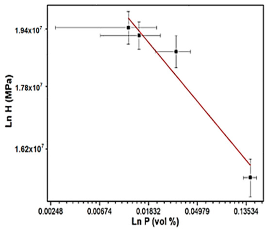 where H is the microhardness of the material, H0 is the microhardness of the 100% dense material, b is a pre-exponential constant, and P is the porosity of the material. Figure 2 shows the relationship between the natural logarithm of the microhardness and the natural logarithm of the porosity index of NiTec coatings. Using the natural logarithm allows making a linearization of the data, obtaining the H0 and the pre-exponential constant b in this process. The value obtained for H0 was 1474 MPa, lower than the hardness reported for NiTec (see Table 2), which demonstrates that the microhardness of the coatings is influenced by other factors such as a crystallographic orientation and defects like un-melted particles and oxide formation. Furthermore, the value obtained for b was 0.08649; the value of this factor depends on the composition of the coating. Paneto et al. [14] showed that the pre-exponential constant b varies between 2 and 8 in ceramic materials and attains its highest value when the ceramic content is greater. The low value of b recorded for NiTec coatings could be a demonstration of the metallic character of these coatings.