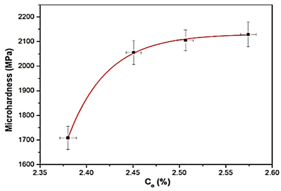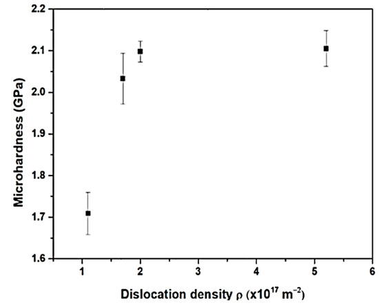 Figure 3 relates the microhardnes with the crystallographic orientation coefficient Co for plane (111) of the NiTec coatings. In the figure, the dependence of the microhardness on Co is clear. This means that for the crystals oriented in the (111) plane, more stress is required to activate dislocations in the crystalline lattice, which coincides with the fact that NiTec coatings with the higher density of dislocations recorded a higher average microhardness [16]. The dislocation density is given by the relation , where represents the dislocation density calculated from the broadening by microdeformation of the lattice and is the dislocation density calculated from the particle size (crystallite size). Here, and , where ε is the lattice microstrain, b is the Burguer vector, F is an interaction factor, which is assumed to be 1, K is a factor that is associated with the dislocation energy and whose value for cubic crystals varies from 14.1 for BCC structures to 16.1 in FCC structures, D represents the crystallite size, and finally n are the dislocations per face of the block, which are assumed to be 1, based on the assumption that the metal is divided into blocks and the dislocations are in the boundaries between the blocks. Thus, the value 1 can be used as a supposition that leads to thinking of a minimum dislocation density [15,16]. Figure 4 shows the microhardness as a function of dislocation density of the NiTec coatings.