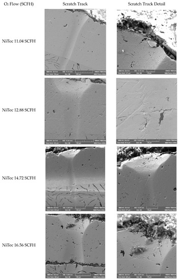 The scratch tracks on the NiTec coatings did not generate a defined cone in the substrate interface, except for the coatings deposited at 16.56 SCFH oxygen flow (see Figure 5). This indicates that the coatings exhibited a cohesive-type failure, and the coating deposited at 16.56 SCFH exhibited an adhesive/cohesive type failure. In this coating, the formation of cracking at the substrate-coating interface was made evident by the scratch test at 15 N load. The scratch tracks also showed porosities in the form of buckled cracks and conformal- and Hertzian-type cracks as a failure mechanism, in addition to the formation of micro cracks by the action of defects in the coating such as unmelted particles and pores.