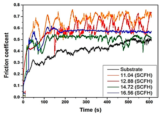 Figure 6 shows the coefficient of friction (COF) curves for NiTec coatings deposited under different oxygen flow conditions, as well as for the gray cast iron substrate, the graphs respond to the curve that is closest, for each coating, to the average data of the adhesive wear test. In the first 100 s of the test, a period called initial adjustment; a progressive increase in the coefficient of friction is seen. This is due to the interaction of the pin and the sample. During this period, a deformation or even wear of the superficial roughness of the coating can result, producing a better coupling of the tribological pair. Likewise, the surface layers of oxide that protect the Ni from oxidation can be worn, and, through the temperature effect reached in the test, new layers of oxide can even be generated. These processes can cause the production of wear particles and adhesive processes between the pin and the sample. After this initial adjustment, the curves show that the friction force is stabilized. The average value of the coefficient of dynamic friction measured during this stabilization time is taken as the coefficient of friction for the tribological couple. Since the friction test consists of repetitive cycles on the sliding track, this track could be degraded due to depletion of the coating or excessive accumulation of wear particles, which can lead to an abrupt increase in the coefficient of friction that entails severe damage to the surface tested [19,20,21,22].