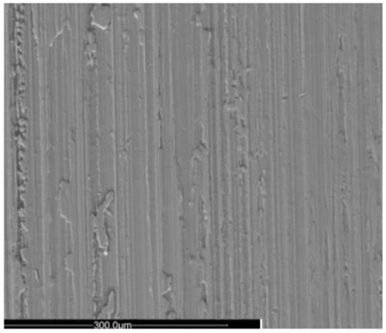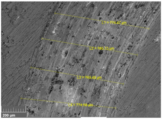 The abrasive wear tests of the NiTec coatings were carried out following procedure B of the ASTM G-65 standard. In this procedure, a load of 130 N is specified on the sample, with 2000 wheel revolutions, which generates a wear distance of 1436 m and using Ottawa sand as abrasive. Figure 12 shows the wear tracks of NiTec coatings obtained via SEM at a scale of 300 μm. The wear traces did not show substantial changes between the coatings deposited under the different oxygen flow conditions. In the images, mainly grooves characteristic of a mechanism of micro-ploughing are shown. In some regions, accumulation of material worn by the formation of a micro-wedge can be seen, as well as, although at a lower density, displacement of material by the mechanism of microcut and plastic deformation of the surface. The appearance of pores due to the detachment of non-molten particles from the matrix of the coatings was also recorded.