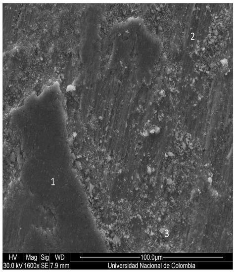In the zone 1 of the Figure 8, flat debris adhered to the surface of the disk is evident. The chemical analysis of the flat areas, performed using the EDS technique, showed a higher concentration of oxygen in these regions compared to other areas of the wear footprint, which suggests that the oxidation of the debris from the coating occurred in the area where these flat areas were formed. The wear marks do not show signs of oxidation.
