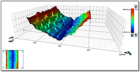 It is possible to use this equation since the wear occurred in the sample and not on the pin, as Figure 9 shows, which shows an image obtained by laser profilometry, of the wear trace of the NiTec coatings, in this image it is clearly appreciated that the pin produces a defined groove on the surface of the coatings when performing the wear test.