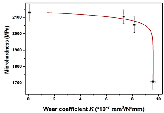 where ΔV is the lost volume, P represents the load applied in the test, and s is the sliding distance for the test. Some authors have shown that the increase in microhardness of the tested sample leads to a subsequent decrease in the wear rate [28].