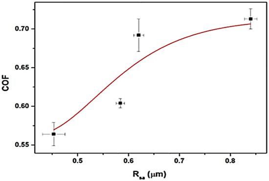 The results of the pin-on-disk tests show that the increase in the microhardness of the coatings coincides with a low rate of wear, which agrees with the reports of Trevisol et al. [24,25]. In Figure 10 is clear that a lower friction coefficient is registered in the coatings with high microhardness values, in the same way, in Figure 11 which relate the coefficient of friction (COF) with the surface roughness of the coatings, high values of average surface roughness, which was determined by confocal laser microscopy, are correlated with high values of the friction coefficient. This behavior is mainly since upon contacting the tribological couple pin-coating, the pin, which is harder than the coatings, deforms or displaces the peaks of the coating. This produces particles that act as an abrasive, generating a wear phenomenon on the three bodies, which directly affects the coefficient of friction of the tribological pair. This phenomenon stabilizes within the duration of the test [22].