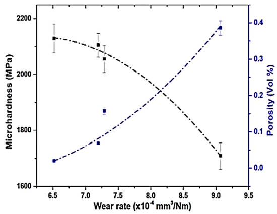 Likewise, Zhang et al. found that high porosity leads to an increase in the wear rate of the coatings [29]. Figure 13 shows the relationship between the microhardness and the wear rate and the degree of porosity of the NiTec coatings. The results indicate that an increase in the wear rate of the coatings produces a decrease in the microhardness, which is in accordance with Archard’s theory and is comparable to the results published by authors such as Melendez et al. and Sandeep Nair et al. [27,30].