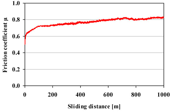 To determine the tribological properties of the investigation coatings, an abrasion test under dry slide friction conditions was carried out by the ball-on-disc method. Three tests were performed for each of the tested coatings. Figure 14 and Figure 15 present the graph of friction coefficient µ changes obtained during wear tests in relation to the sliding distance.