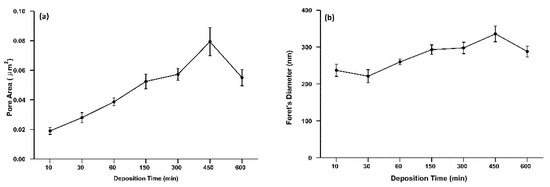 SEM analysis of the samples was carried out using a Dual Beam Quanta 200 3D (FEI, Hillsboro, UK). Prior to imaging the surface, it was coated (~12–17 nm) in gold-palladium to reduce surface charge effects. The sample surface was sputter coated with gold-palladium using an Emitech K500X SEM preparation sputter system. The images contained in this work were collected at an accelerating voltage of 10 kV and a working distance of 8–15 mm. The average pore area, number of pores, and Feret’s diameter of the pores in each sputter deposited thin film were calculated using ImageJ software (Version 1.8.0) (National Institute of Health, Bethesda, MD, USA). In total, 3 areas were analysed from each sample.